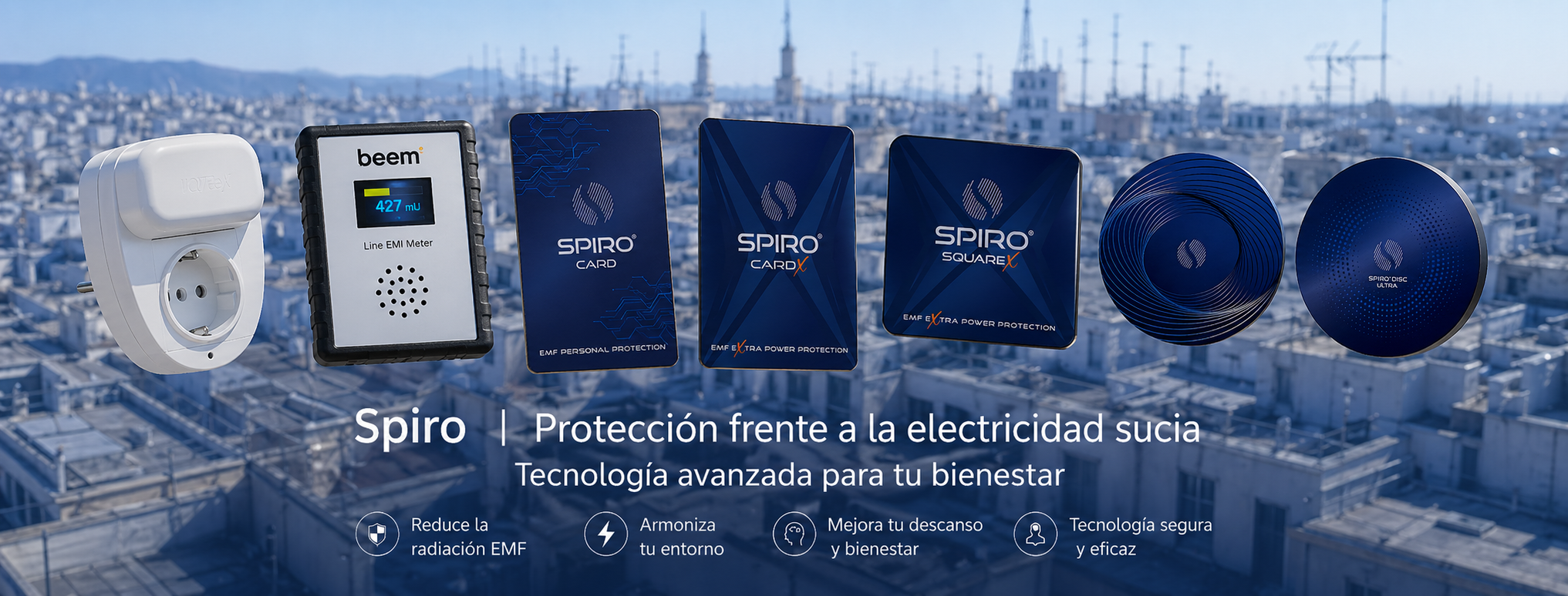 Los productos SPIRO filtran las perturbaciones electromagnéticas generadas por dispositivos electrónicos, transformando los campos nocivos en frecuencias más seguras. Esto reduce la exposición a radiaciones dañinas tanto de altas como de bajas frecuencias, mejorando el entorno electromagnético del hogar.